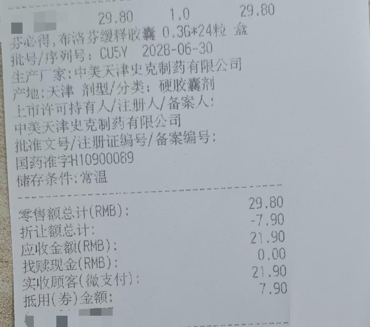 红星资本局走访调查发现,多家药店工作人员均表示,门店线下购买不能按照外卖价格支付。但在一家海王星辰门店,记者以外卖的价格购买到了布洛芬。该门店工作人员拍下美团外卖21.9元的价格截图后,让记者自费支付,并让记者在小票上签字、留下电话号码。