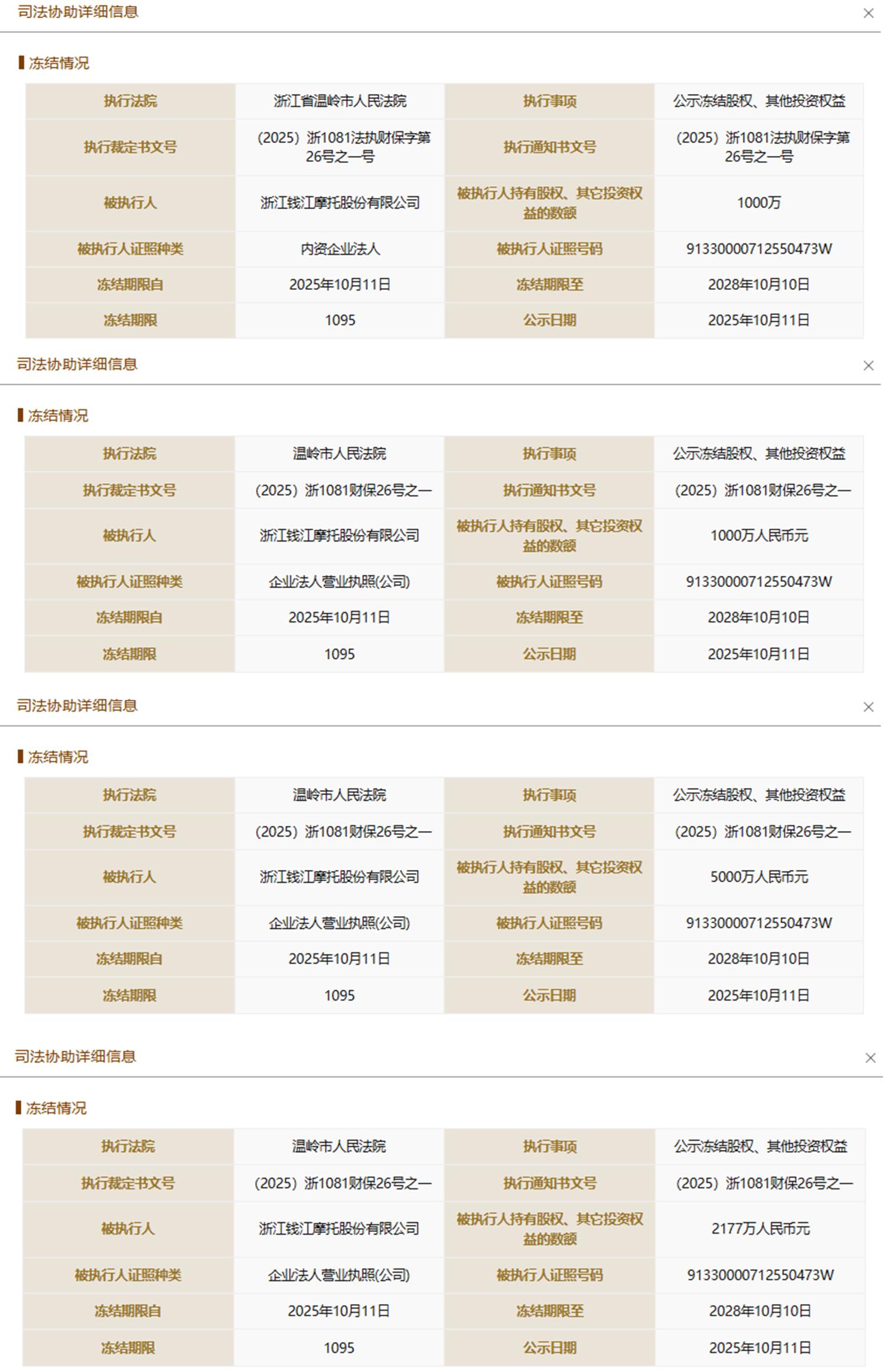 中新经纬10月16日电 国家企业信用信息公示系统显示,近日,浙江钱江摩托股份有限公司(下称:钱江摩托)新增4条股权冻结信息,冻结股权数额合计9177万人民币,股权所在企业为钱江摩托(上海)有限公司、浙江钱江摩托技术开发有限公司、浙江钱江摩托进出口有限公司、格雷博智能动力科技有限公司,冻结期限均为3年,执行法院为温岭市人民法院。