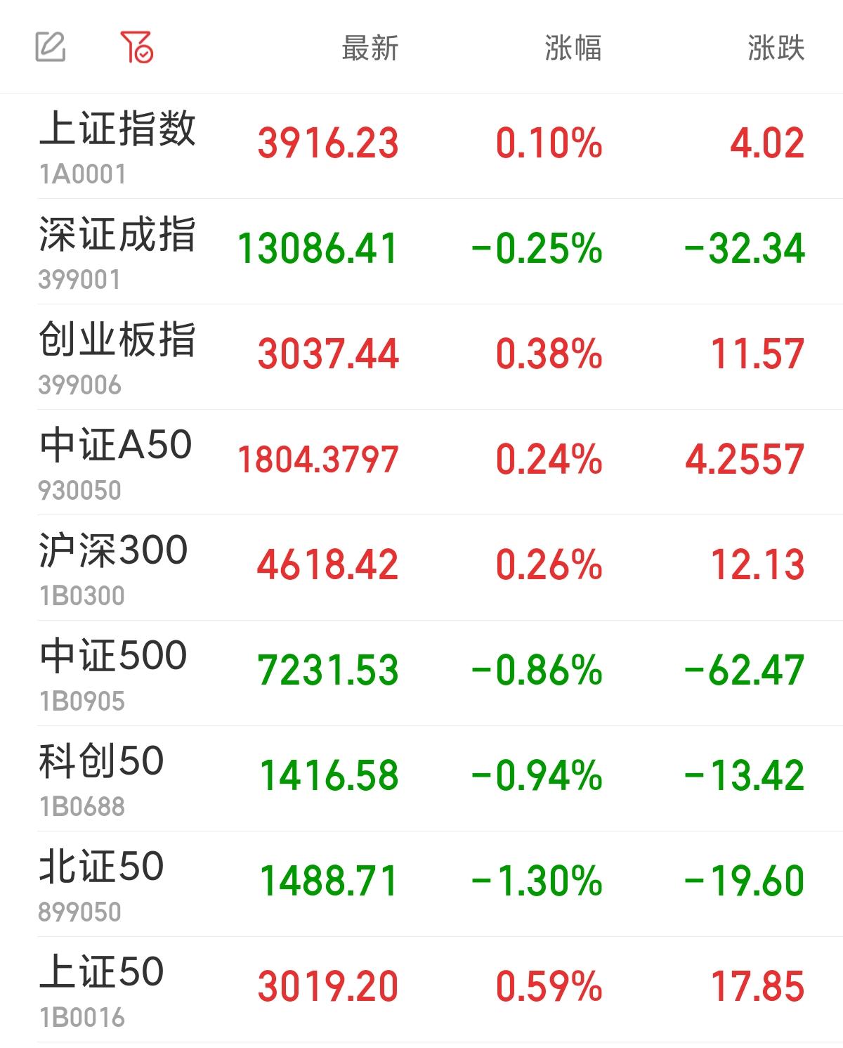 中新经纬10月16日电 周四,A股三大指数集体低开,此后冲高回落。截至收盘,上证指数涨0.10%,报3916.23点;深证成指跌0.25%,报13086.41点;创业板指涨0.38%,报3037.44点。