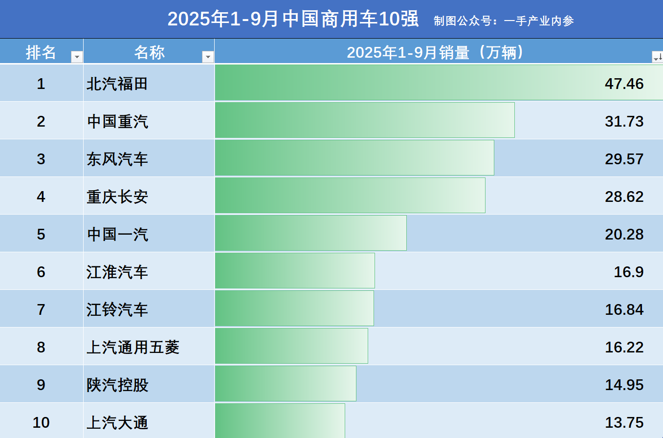 另附:2025年1-9月中国商用车销量10强厂商名单,数据源于:卡车信息网。