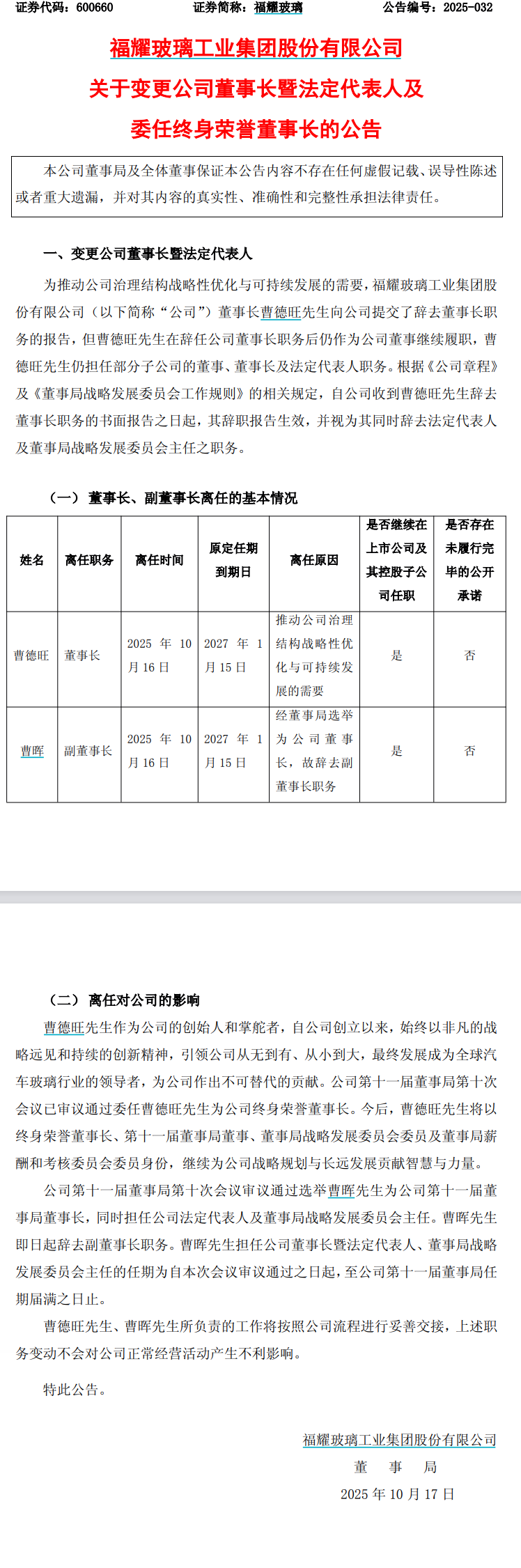 同时,公司选举曹晖为新任董事长,并任命其为法定代表人及董事局战略发展委员会主任。曹德旺被委任为公司终身荣誉董事长。