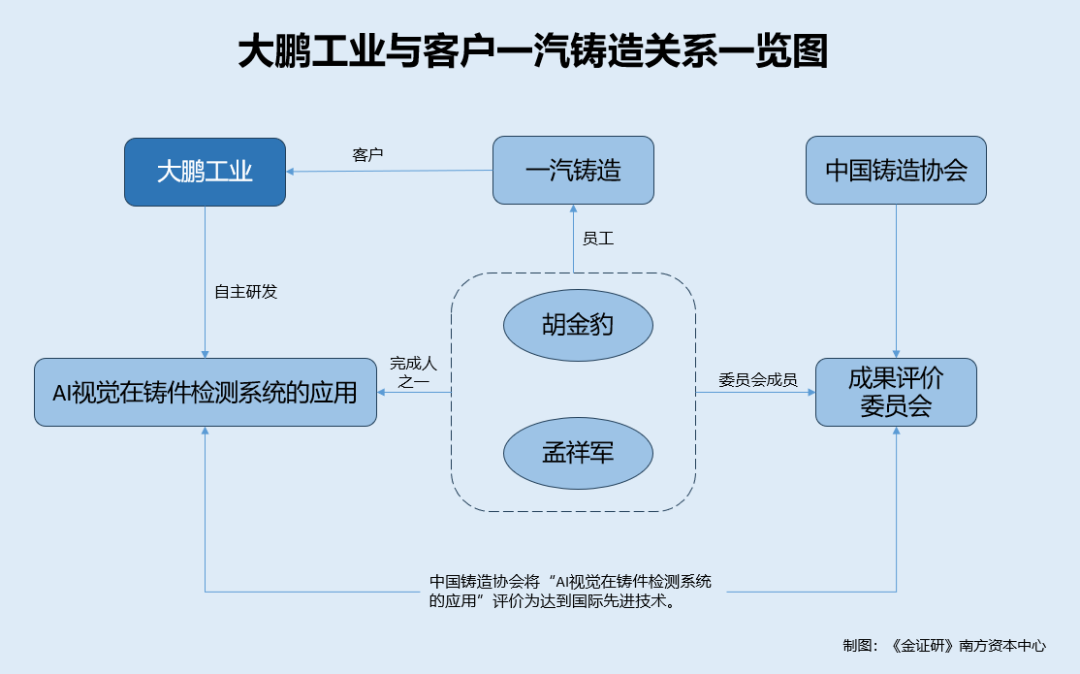 而研究发现,参与该技术成果评价的评价委员会成员包括一汽集团的胡金豹等。其中,一汽集团及其一汽铸造均系大鹏工业客户。官方信息显示,“AI视觉在铸件检测系统的应用”项目的完成单位为大鹏工业、一汽铸造,该项目完成人包括胡金豹。并且,胡金豹系中国铸造协会副会长。