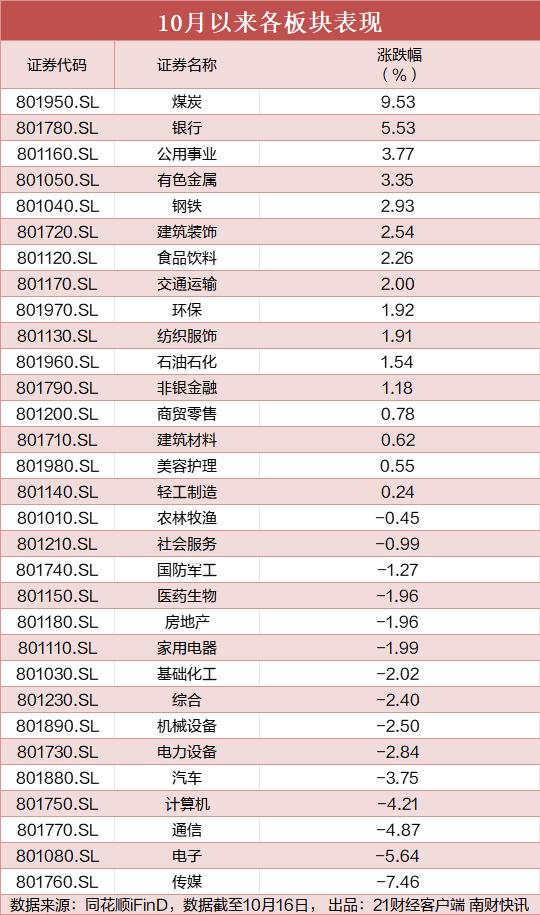21财经·南财快讯记者梳理发现,10月以来,银行、煤炭板块均已实现连续多日上涨,港口、白酒等板块亦涨幅靠前;而电子、通信、汽车、计算机等板块回调明显,相较节前科技叙事带动股价大幅上涨的市场行情出现明显的风格切换。