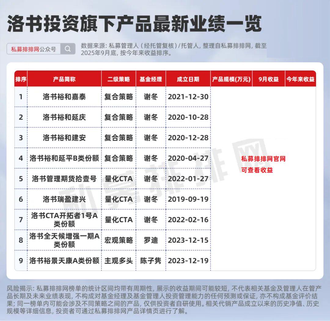 私募排排网数据显示,洛书投资旗下有业绩显示的产品共9只,9月份收益均值为***%,今年来收益均值高达***%。其中创始人谢冬管理的“洛书裕和嘉泰”今年来收益高达***%,表现较为亮眼。