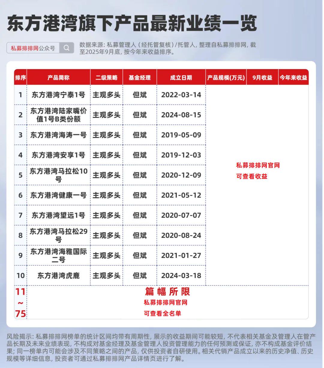 私募排排网数据显示,东方港湾旗下有业绩显示的产品共75只,9月份同样斩获亮眼收益,收益均值高达***%,今年来收益均值高达***%。其中但斌管理的“东方港湾宁泰1号”今年来收益为***%,表现较为突出。