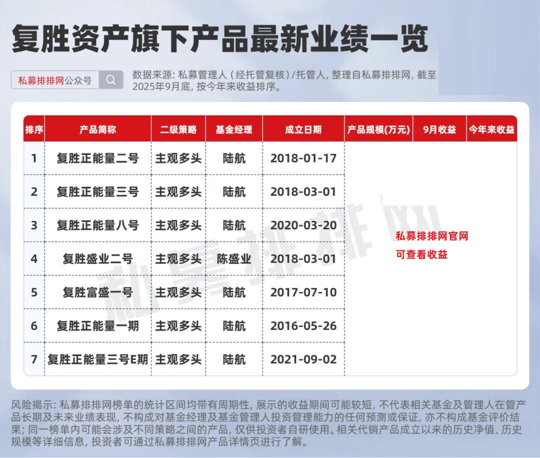 私募排排网数据显示,复胜资产旗下有业绩显示的产品共7只,9月份斩获亮眼收益,收益均值高达***%,今年来收益均值高达***%。其中陆航管理的“复胜正能量二号”今年来收益高达***%,表现较为突出。