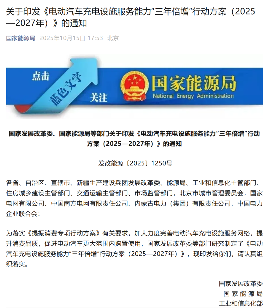 消息面上,10月15日,国家发改委等六部门联合印发《电动汽车充电设施服务能力“三年倍增”行动方案(2025-2027年)》(下称《行动方案》),明确提出到2027年底,在全国建成2800万个充电设施,提供超3亿千瓦公共充电容量,满足超过8000万辆电动汽车充电需求,实现充电服务能力翻倍增长的目标。