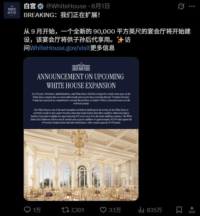 特朗普长期主张现代白宫需要专业宴会厅承办国事活动,并提到奥巴马任期内国宴常在南草坪临时帐篷举行,他曾自荐出资修建宴会厅但遭拒绝。据政府官员介绍,新宴会厅将容纳650个座位,远超当前仅能容纳200人的白宫东厅。