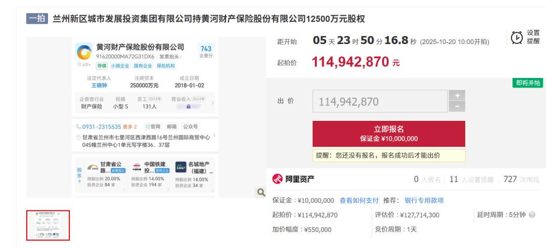 近日,阿里资产拍卖平台显示,兰州新区城市发展投资集团有限公司(下称“兰州新区城投”)所持黄河财产保险股份有限公司(下称“黄河财险”)1.25亿元股权将于10月20日公开拍卖。