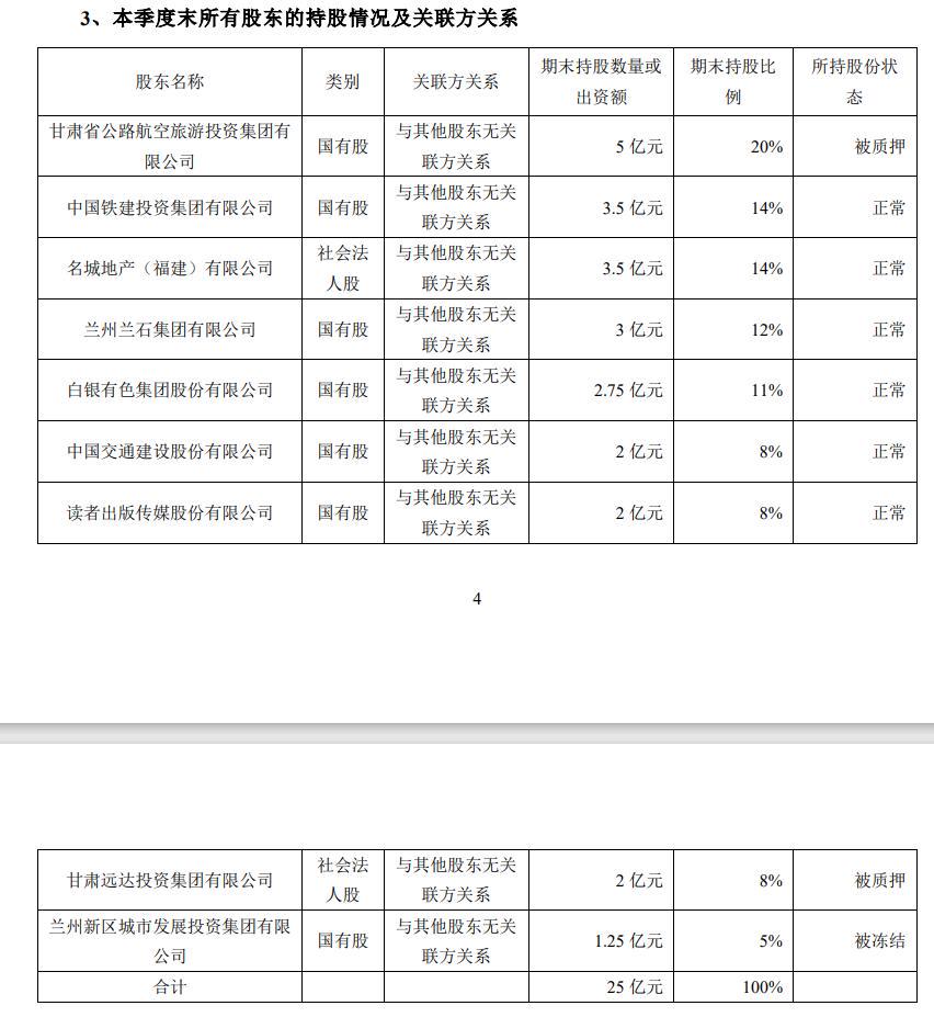 截至2025年第二季度偿付能力报告,公司共有九家股东,包括甘肃省公路航空旅游投资集团有限公司(下称“公路航旅”)、中国铁建投资集团有限公司、名城地产(福建)有限公司、兰州兰石集团有限公司、白银有色集团股份有限公司、中国交通建设股份有限公司、读者出版传媒股份有限公司、甘肃远达投资集团有限公司(下称“甘肃远达投资”)以及兰州新区城投。其中,第一大股东公路航旅,在2024年内对其所持股权发起了高达29次质押。