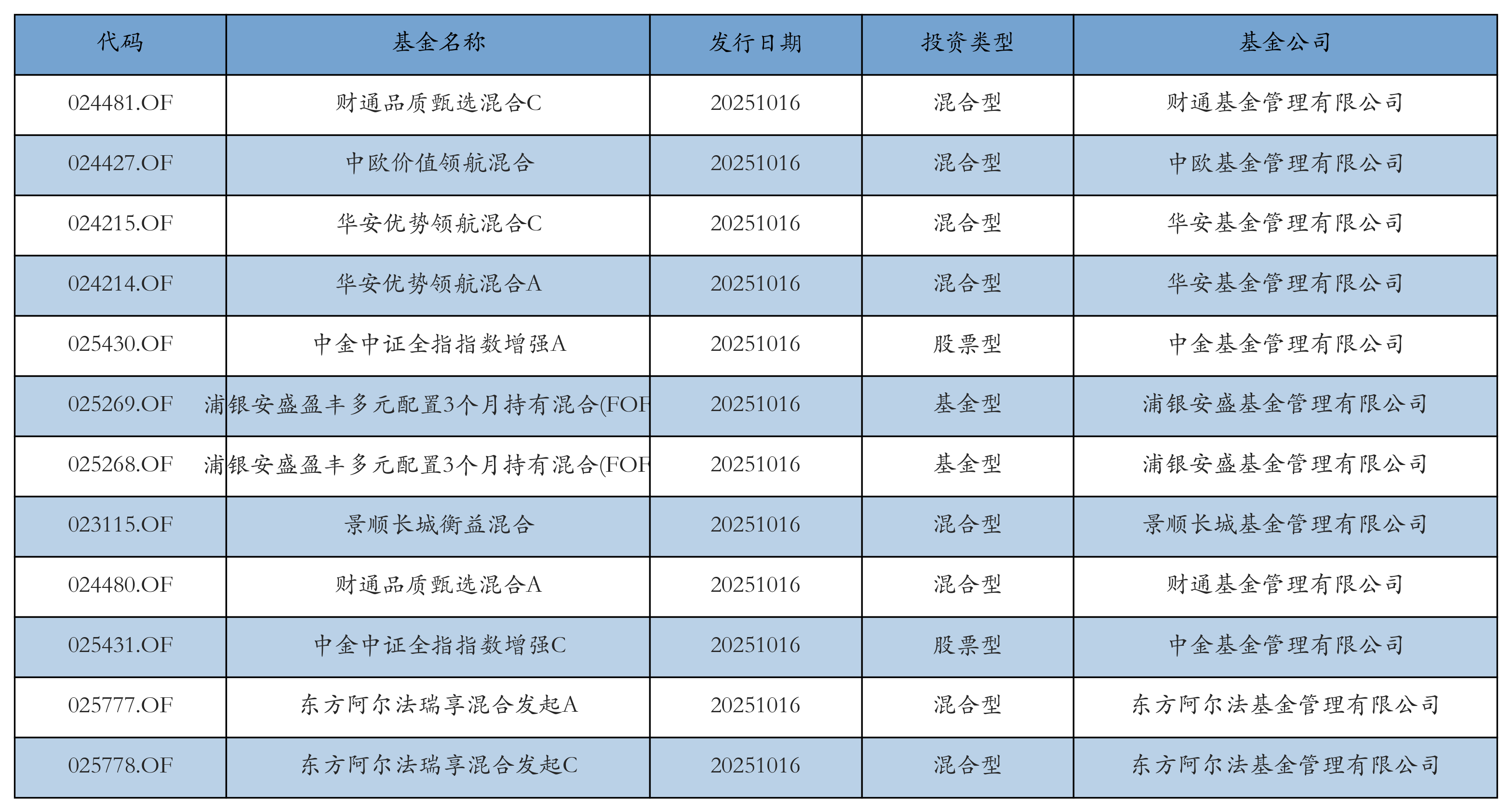 昨日有12只新基金发行,分别为:财通品质甄选混合C、中欧价值领航混合、华安优势领航混合C、华安优势领航混合A、中金中证全指指数增强A、浦银安盛盈丰多元配置3个月持有混合(FOF)C、浦银安盛盈丰多元配置3个月持有混合(FOF)A、景顺长城衡益混合、财通品质甄选混合A、中金中证全指指数增强C、东方阿尔法瑞享混合发起A、东方阿尔法瑞享混合发起C,详情见下表: