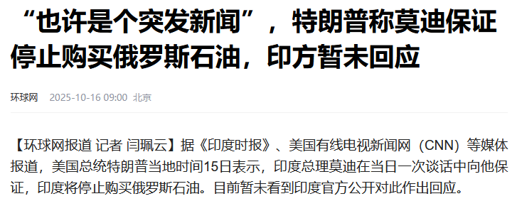 10月15日,特朗普在白宫记者会上说,印度总理莫迪已经向他保证,印度将停止购买俄罗斯石油,虽然需要一定的时间过渡,但这个过程会很快。
