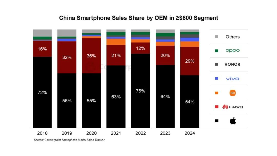 中国智能手机品牌厂商在600 美元以上价格段的销量份额,图/Counterpoint