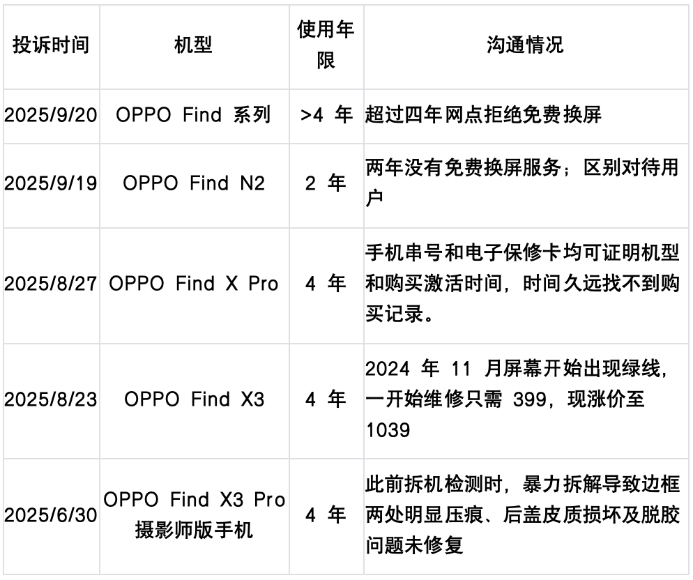 时间推移至2025年,首批Find X3系列陆续进入四年保修期的尾声,硬件老化让绿线问题集中爆发。而当用户想进行维修之时,即便仍在四年质保期内,售后仍以“系统缺少档案”,“无发票”等理由拒保。于是,消费者的质疑集中于一句话: