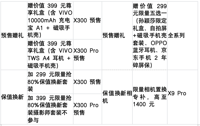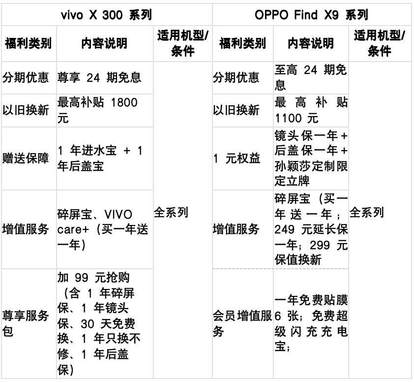 从标准版来看,vivo X300主摄像素更高,OPPO Find X9焦段更灵活,后者的续航表现更优。性能是一部分,权益也很重要,在国内厂商皆经受过供应商质量缺陷问题舆论风波之后,vivo、OPPO在售后权益上也是比以往完善了不少。
