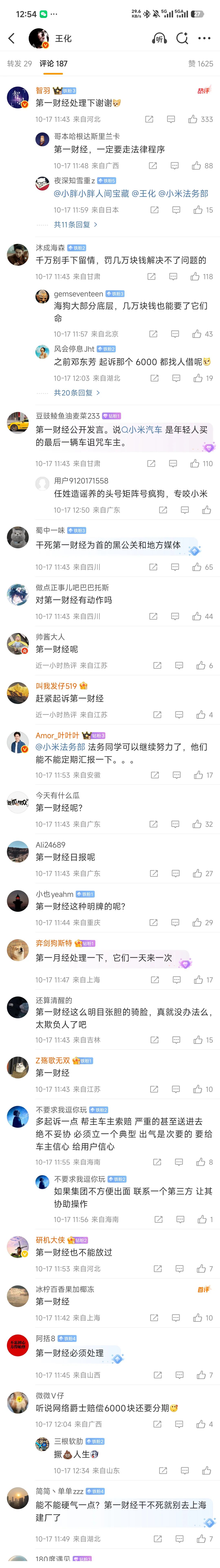 10月17日,小米集团公关部总经理王化在微博对小米车主遭遇网络攻击做出回应。然而,在这条微博评论区,大量小米粉丝指责第一财经“公开诅咒小车车主”,甚至发起集体声讨。