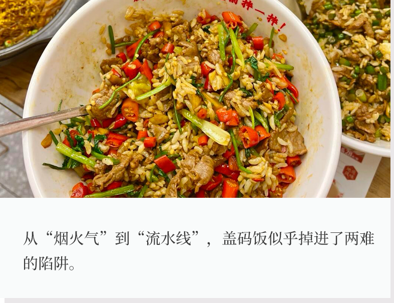 从“烟火气”到“流水线”,机炒盖码饭的确让中式快餐进入了一个新的效率时代。标准化出餐、统一化供应链,让它能在短时间内“攻占外卖榜”,满足庞大的打工人午餐需求。