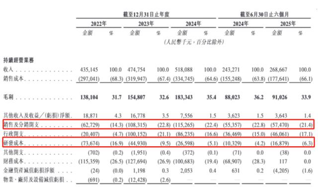 然而,这一战略导向在随后两年发生显著逆转。到2024年,公司研发支出较2022年大幅缩减64%,营收占比骤降至5.1%;与之形成鲜明对比的是,销售及分销开支同期增长84%,营收占比攀升至22.4%,两者绝对值的差距扩大至超过8000万元。与此同时,公司行政开支也较2022年实现数倍增长。