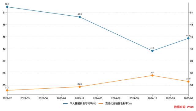 在集采压价、新生儿数量下滑的背景下,基因测序龙头华大基因与贝瑞基因的NIPT赚钱能力大打折扣,今年上半年,这两家头部企业的NIPT业务断崖式下滑,毛利率承压,而市占率远不及华大基因的安诺优达NIPT赚钱能力可想而知,其盈利空间也受到进一步挤压。报告期内公司临床测序板块毛利率已从2022年的43.4%降至2025年上半年的38.1%,核心产品NIPT试剂盒的毛利率也呈现下滑趋势,由2022年的50.9%下滑至2025年上半年的48.6%。不仅如此,与我国NIPT龙头华大基因对比,安诺优达的综合毛利率也偏低。