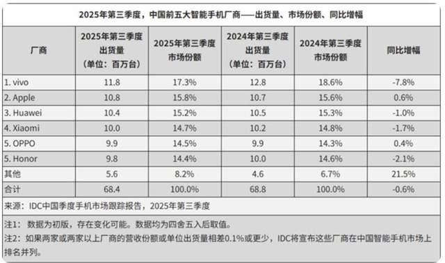 10月16日,权威市场调研机构Omdia公布了统计日期截至10月的2025年第三季度中国智能手机市场的出货量战况,其中 vivo凭1180万台的出货量拿下季度冠军,华为凭1050万台的成绩排名第二 ,苹果和小米分列三、四名,OPPO拿下第五,荣耀被划进了Others。