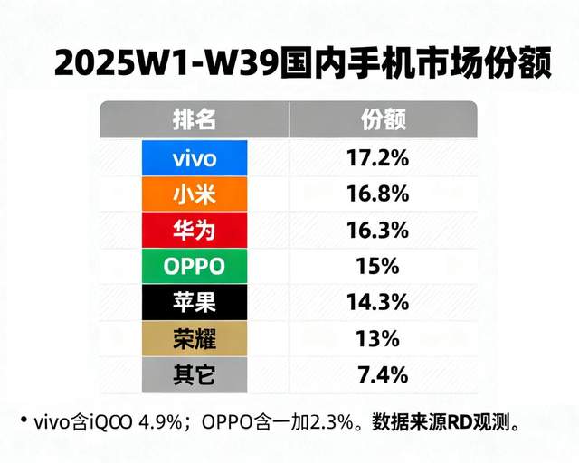 此外,IDC和Omdia等机构方面关于国内&全球2025年前三季度的整体大盘还尚在统计流程中,根据长期聚焦国内手机市场数据变化的 “RD观测”的统计,截至25Q9,主流手机品牌国内份额的排名如下: