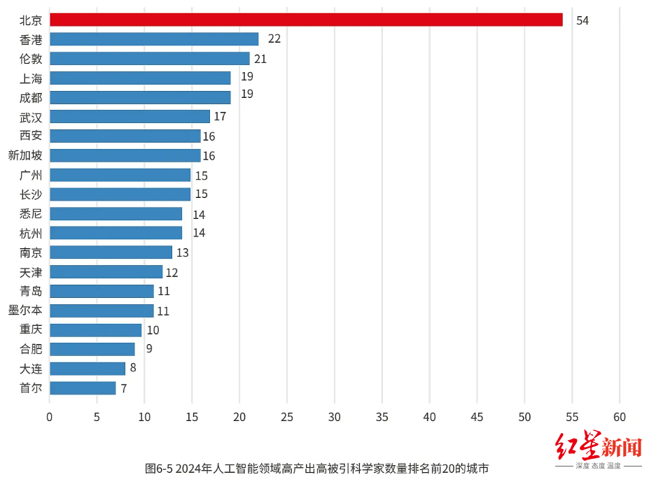 根据论文发表数量、被引次数、论文篇均引用量筛选出的高产出、高被引科学家,2024年在全球被评估的125个城市中共计461名(FOR学科分类三个细分指标均属于人工智能学科领域),其中科学家数量排名前五的城市依次为北京(54名)、香港(22名)、伦敦(21名)、上海(19名)、成都(19名)、武汉(17名)。成都与上海并列全球第四,成为西部唯一进入该榜单前五的城市。