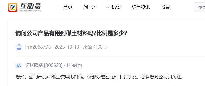 【V观财报丨亿联网络:仅部分磁性元件涉及稀土使用】亿联网络17日通过深交所互动易平台回答投资者提问称,公司产品中稀土使用比例低,仅部分磁性元件中会涉及。(中新经纬APP)