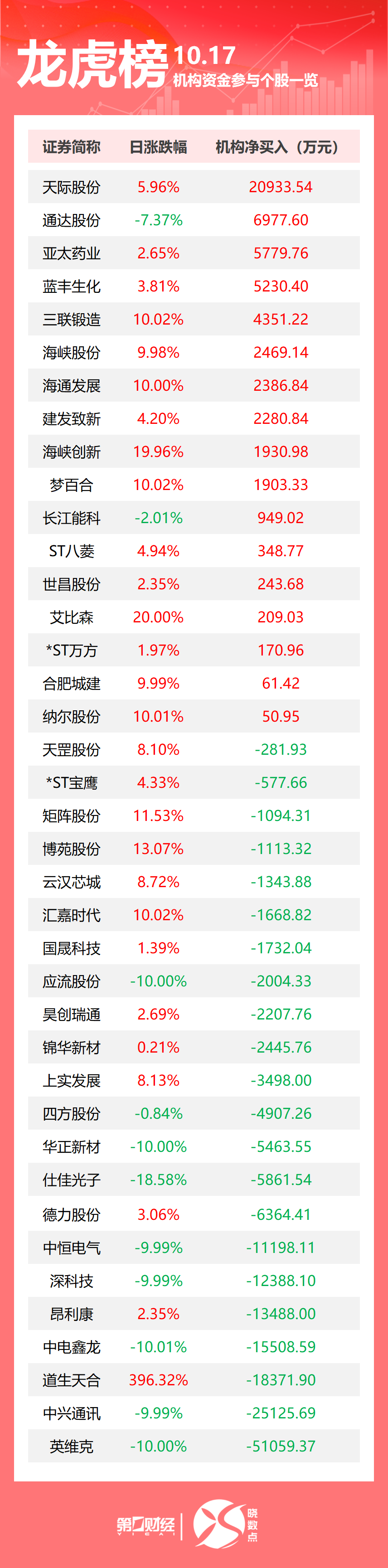当天机构净买入前三的股票分别是天际股份、通达股份、亚太药业,净买入金额分别是2.09亿元、6978万元、5780万元。