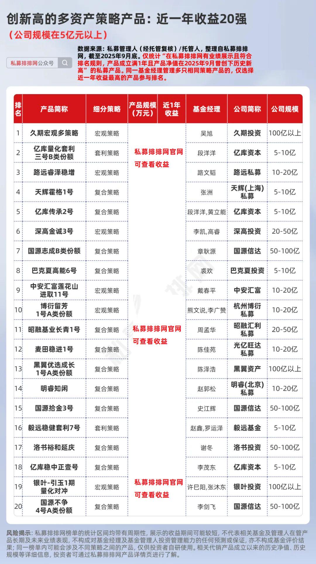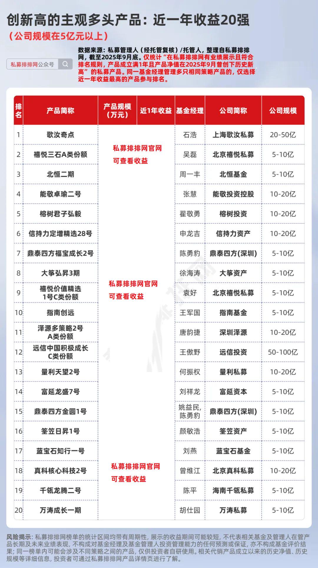 据私募排排网数据,来自5亿以上规模私募的创新高产品中,核心策略为“股票-主观多头”的产品共有606只。根据上文规则,笔者筛选出了“创新高的主观多头产品近一年收益20强”,上榜“门槛”接近***%。