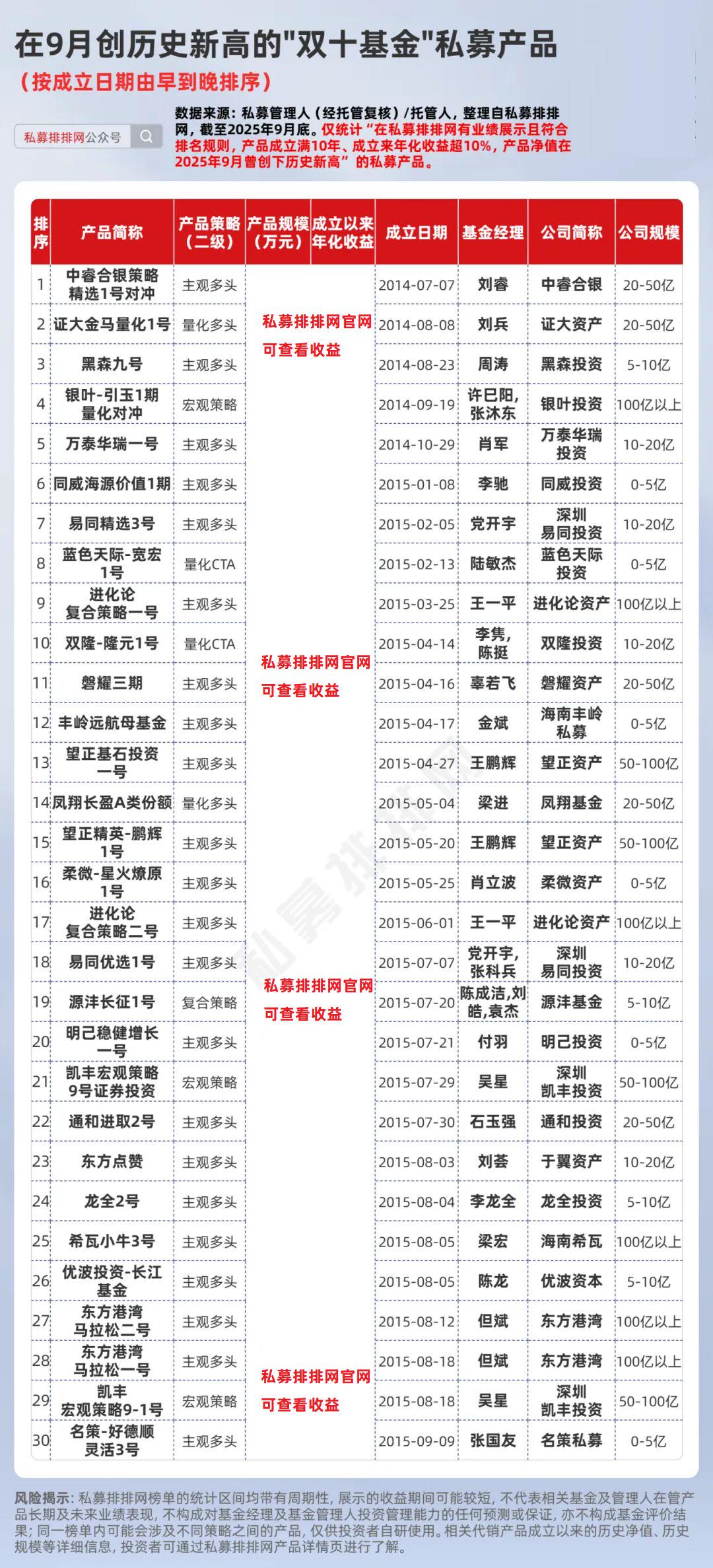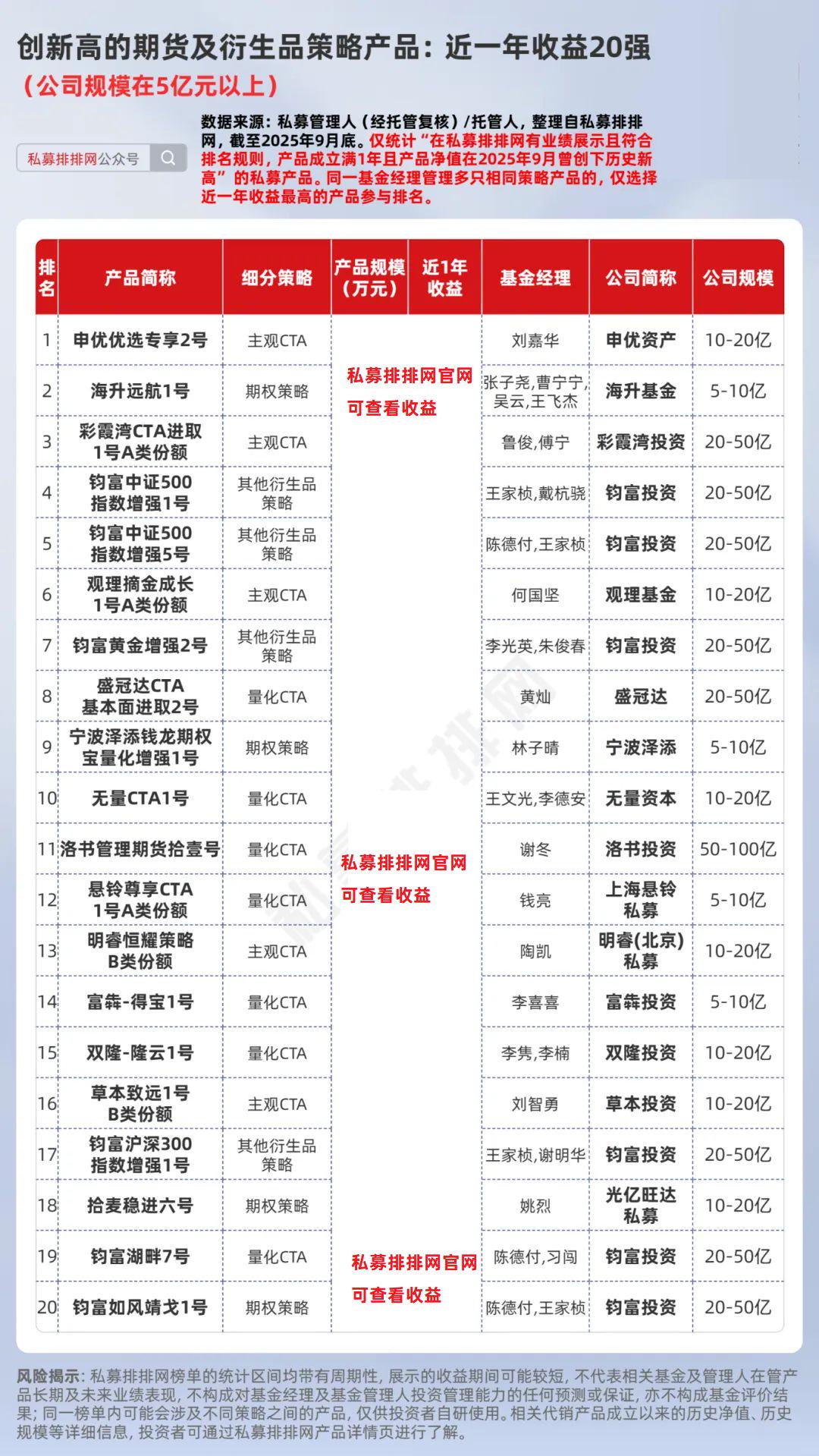 此外,来自双隆投资旗下李隽、李楠共同管理的量化CTA产品“双隆-隆云1号”是一只“双十基金”。该产品最新规模约***万元,近一年收益接近***%,位列第15。该产品成立于2015年4月14日,截至2025年9月底,成立来年化收益接近***%。