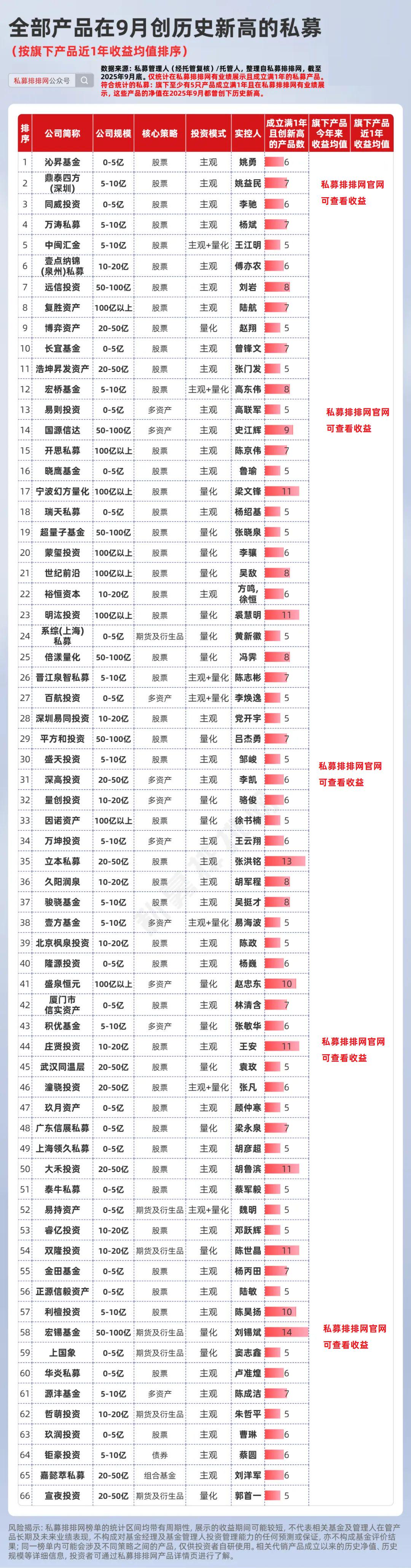 经笔者梳理发现,在私募排排网有5只以上私募产品成立满1年且全部在9月创了历史新高的私募,共有66家。