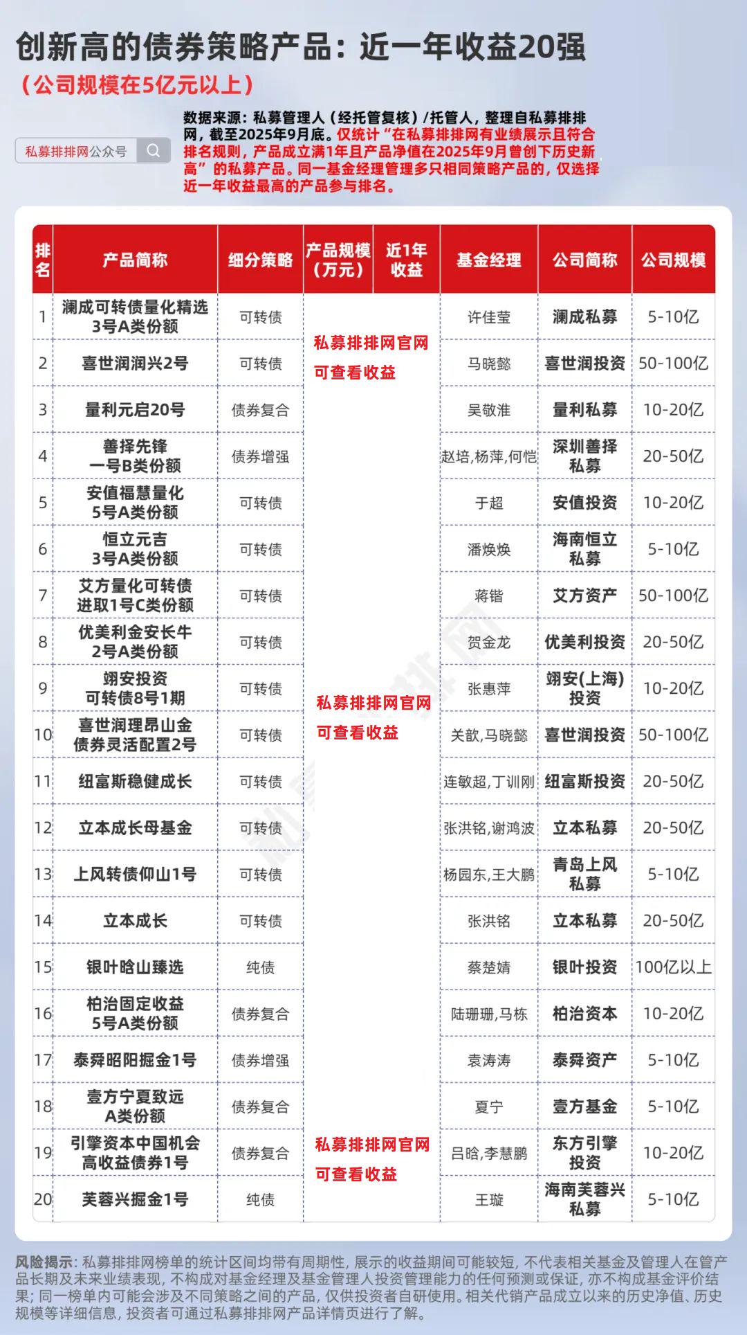 据私募排排网数据,来自5亿以上规模私募的创新高产品中,核心策略为“债券策略”的产品共有128只。根据上文规则,笔者筛选出了“创新高的债券策略产品近一年收益20强”,上榜“门槛”超***%。细分策略来看,可转债策略产品占12只。