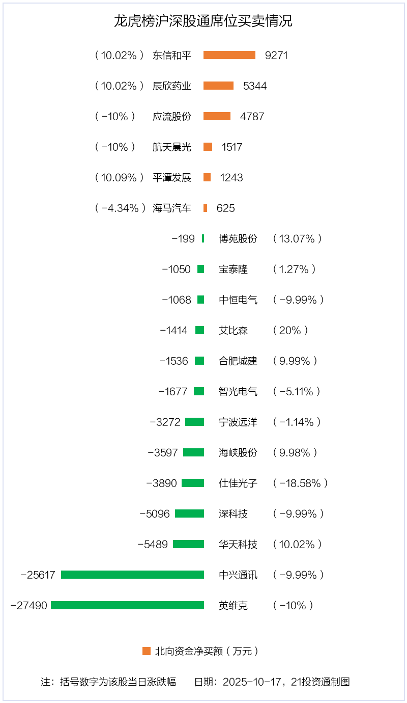 10月17日,上证指数下跌1.95%,深证成指下跌3.04%,创业板指下跌3.36%。盘后龙虎榜数据显示,共有49只个股因当日异动登上龙虎榜,资金净流入最多的是东信和平(002017.SZ),达3.64亿元。