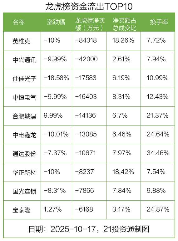而龙虎榜中资金净流出最多的是英维克(002837.SZ),被净卖出为8.43亿元,占总成交金额的18.26%。英维克收盘下跌10%,换手率为7.72%。