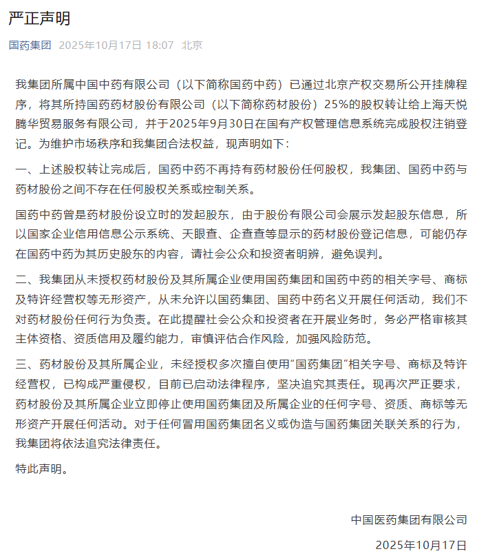 10月17日, 国药集团发布声明称,集团所属中国中药有限公司(简称国药中药)已通过北京产权交易所公开挂牌程序,将其所持国药药材股份有限公司(以下简称药材股份)25%的股权转让给上海天悦腾华贸易服务有限公司,并于2025年9月30日在国有产权管理信息系统完成股权注销登记。