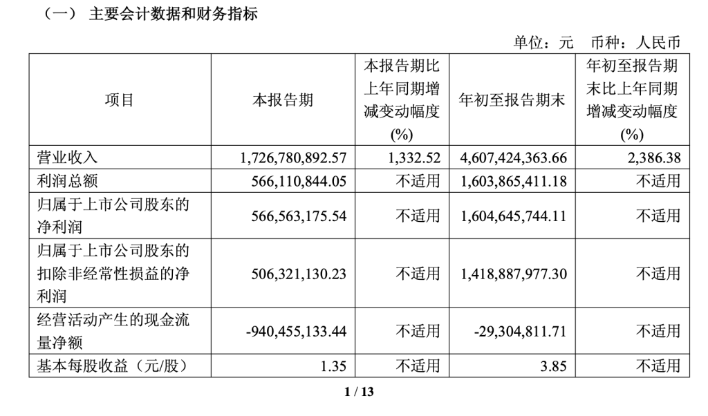 10月17日晚,寒武纪(688256)公告第三季度业绩,期内营收为17.27亿元,连续三个季度营收规模超过10亿元,同比增长1332.52%,环比下降2.4%;净利润为5.67亿元,连续四个季度实现盈利,环比下降了17%;基本每股收益为1.35元。经营活动产生的现金流为-9.4亿元。