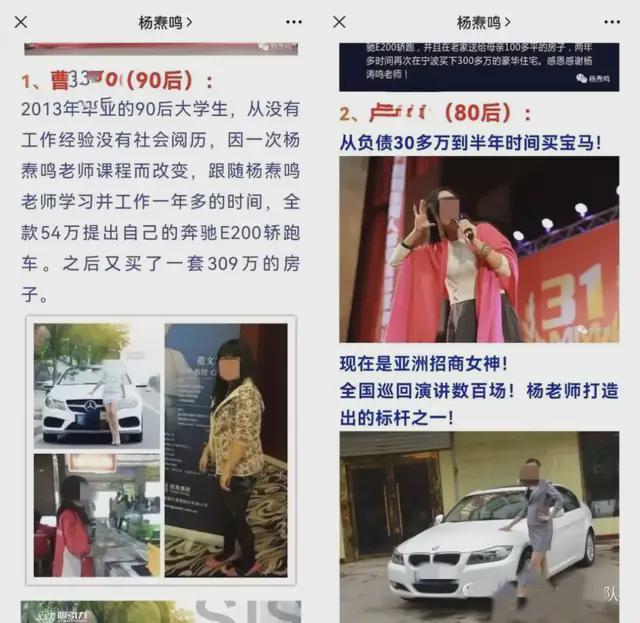此外,多位老学员的现身说法不断加深着课程的可信度:只有初中学历的学员原本到处打零工,在上了杨涛鸣的课一年多时间后,不仅拥有了自己的奔驰车,还送给老婆一套310万元的豪宅;月入几千的小会计,结缘杨涛鸣后年薪百万;没有阅历的大学生也通过他的课程,学会了如何给人演讲,就此翻身,买房买车......