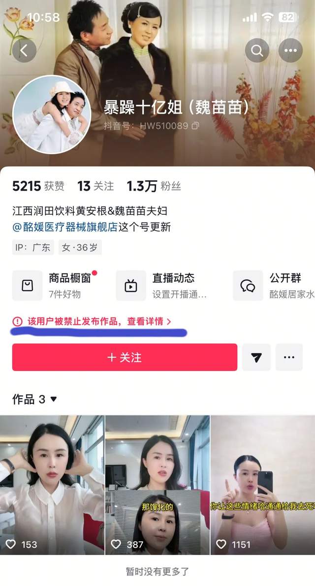 因为价值观、婚恋观、人生观与公序良俗不符,在今年7月份曾经引发社交媒体大讨论的——江西润田饮料创始人黄安根现任老婆魏苗苗,近日,其视频账号“暴躁十亿姐”突然遭到抖音平台封禁。