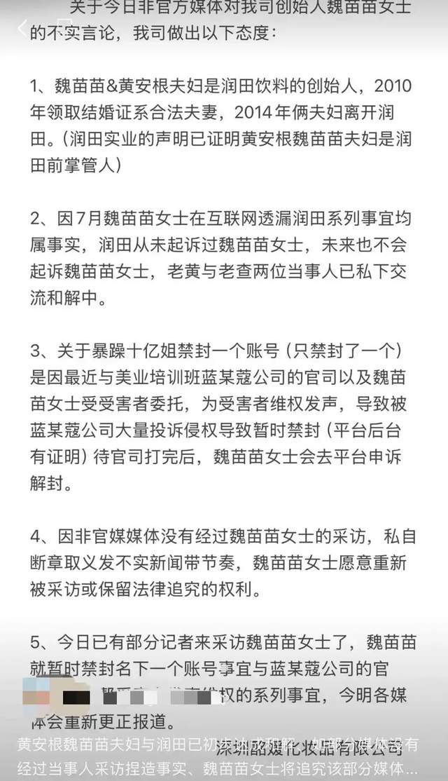 在魏苗苗视频账号遭到抖音平台封禁之后,有媒体猜测是因为润田方面投诉。10月17日,魏苗苗名下公司“深圳酩媛化妆品”发布公开回应,否认封号与润田有关,并就网友关注的婚姻状态及账号被封原因作出说明。称,夫妇俩人是润田饮料的创始人,2010年领取结婚证系合法夫妻,2014年双双离开润田。魏苗苗在互联网透漏润田系列事宜均属事实,润田从未起诉过魏苗苗,未来也不会起诉,俩夫妇与润田已经初步达成和解。