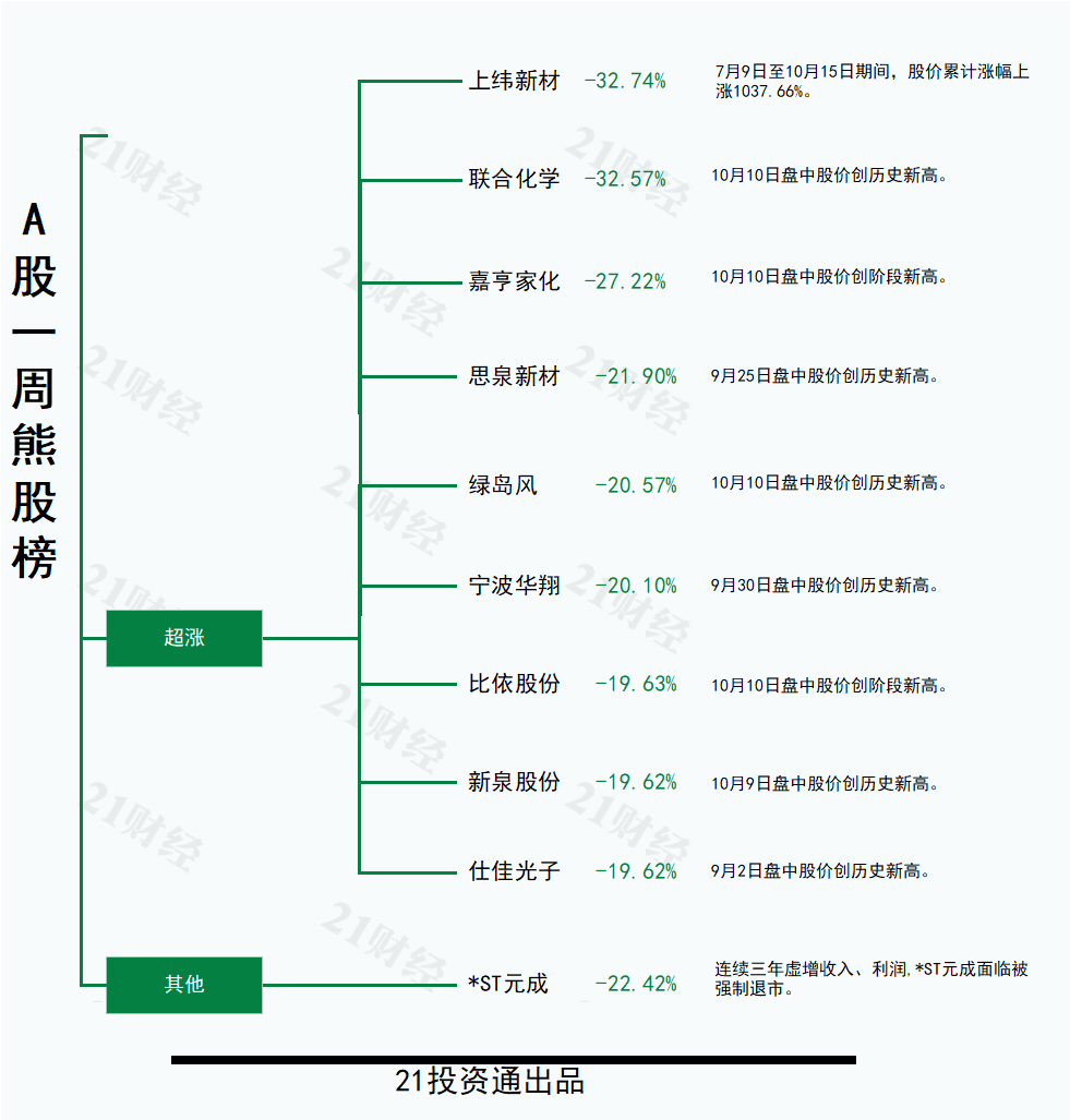 剔除最近一月上市的次新股后,本期(10月13日至17日)沪深两市熊股榜中,上纬新材(688585.SH)以32.74%的跌幅成为本期“最熊股”,联合化学(301209.SZ)紧随其后,周跌幅达32.57%。嘉亨家化(300955.SZ)、*ST元成(603388.SH)、思泉新材(301489.SZ)等多股周跌幅亦超20%。