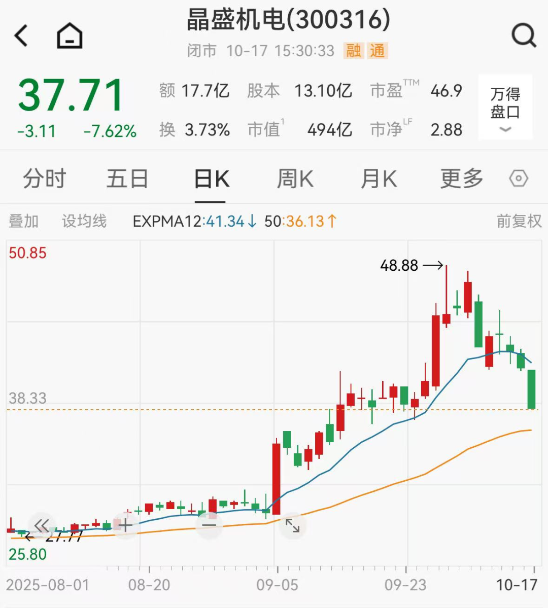 截至10月17日收盘,晶盛机电跌7.62%,报37.71元/股,市值494亿元,距离10月9日年内高位蒸发近130亿元。