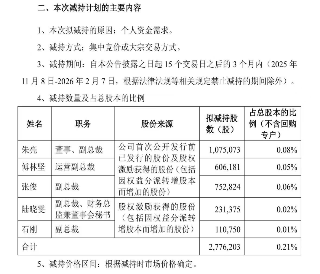10月17日,晶盛机电(300316.SZ)发布董事及高管减持股份预披露公告。公告显示,包括公司董事、副总裁朱亮等在内的5位董事及高管计划在2025年11月8日至2026年2月7日期间,以集中竞价或大宗交易方式减持公司股份合计不超过277.62万股,占公司剔除回购专用账户股份后的总股本比例0.21%。