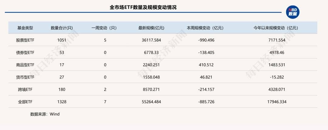 Wind数据显示,截至10月18日,上市ETF总数量为1328只,总规模为5.53万亿元。从数量来看,本周新增7只ETF,其中5只为股票型ETF,剩余2只为跨境ETF。
