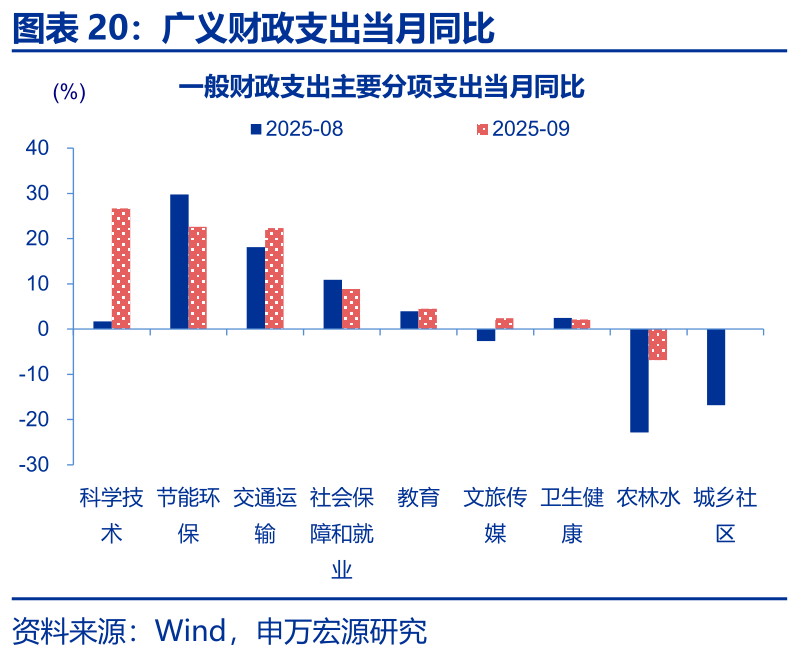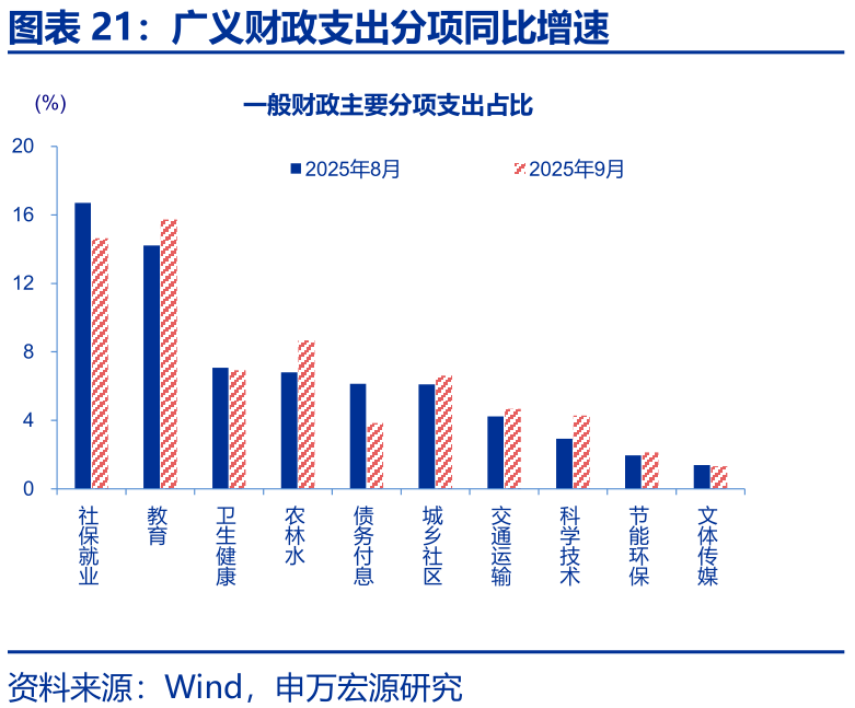 一般财政支出分项中,科技环保和基建相关支出增速较高。2025年9月,一般财政支出同比3.1%,较8月回升2.3个百分点;支出分项中,科技环保和基建相关支出增速较高,如科学技术、节能环保、交通运输支出增速分别为26.7%、22.6%、22.3%;农林水、教育、科学技术占比提升,较8月分别提升1.9、1.5、1.4个百分点。2025年9月一般财政支出预算完成度为9.7%,持平于过去五年同期平均水平。