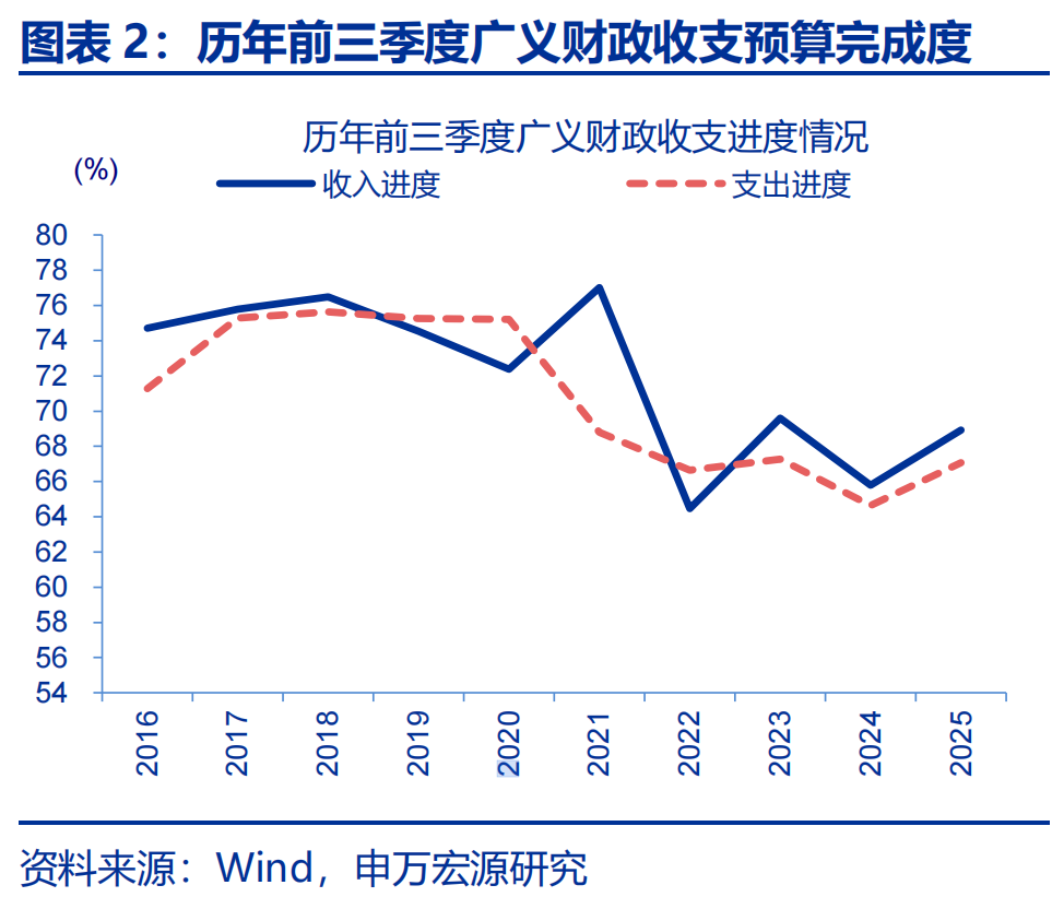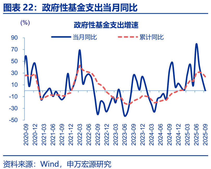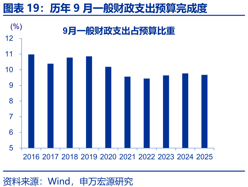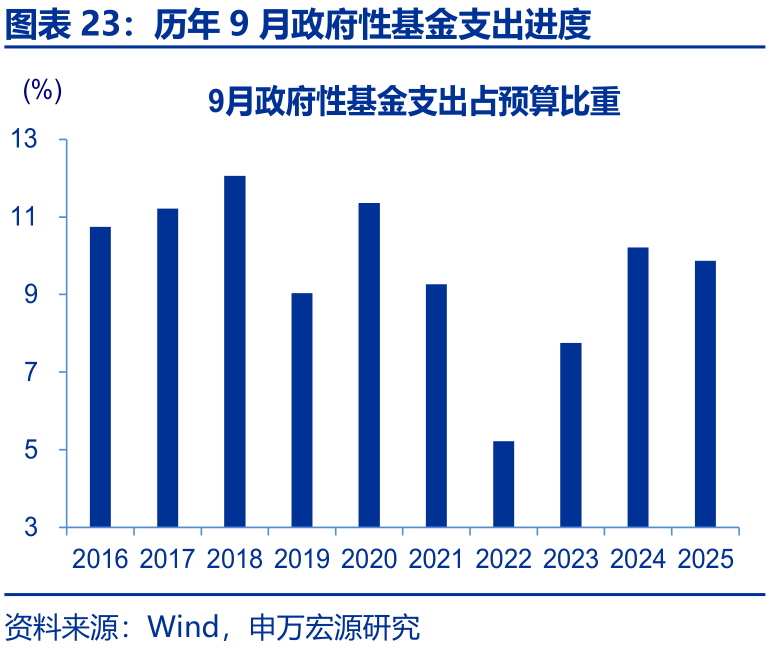 政府债大规模支持接近尾声,使得政府性基金支出增速明显放缓。2025年9月政府性基金支出同比0.4%、较8月增速回落超19个百分点。政府性基金支出回落,部分缘于地方国有土地出让收入增速下滑,9月同比-10.3%;同时,基于政府债务融资支持的财政前置加力支出或也接近尾声。从预算完成度看,2025年9月政府性基金支出预算完成度9.9%,高于过去五年同期平均的8.8%。