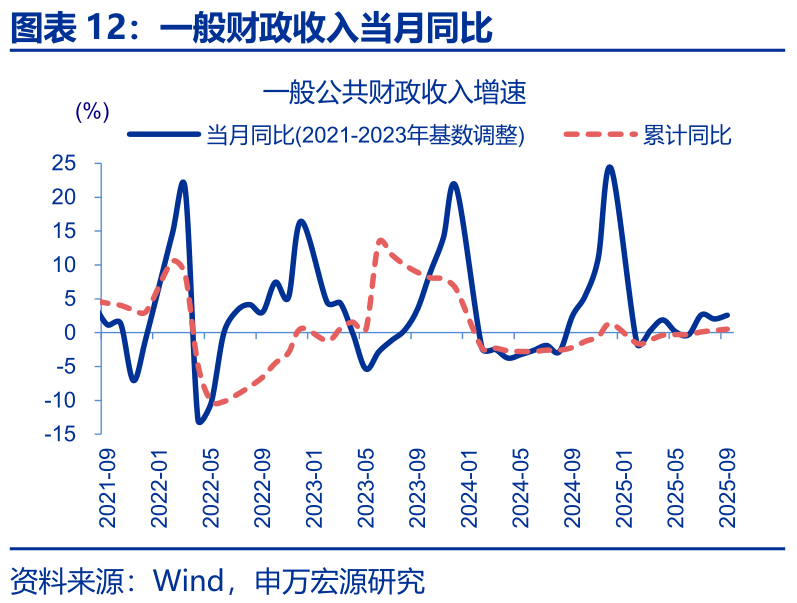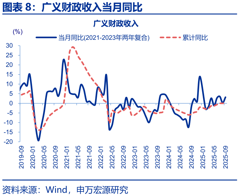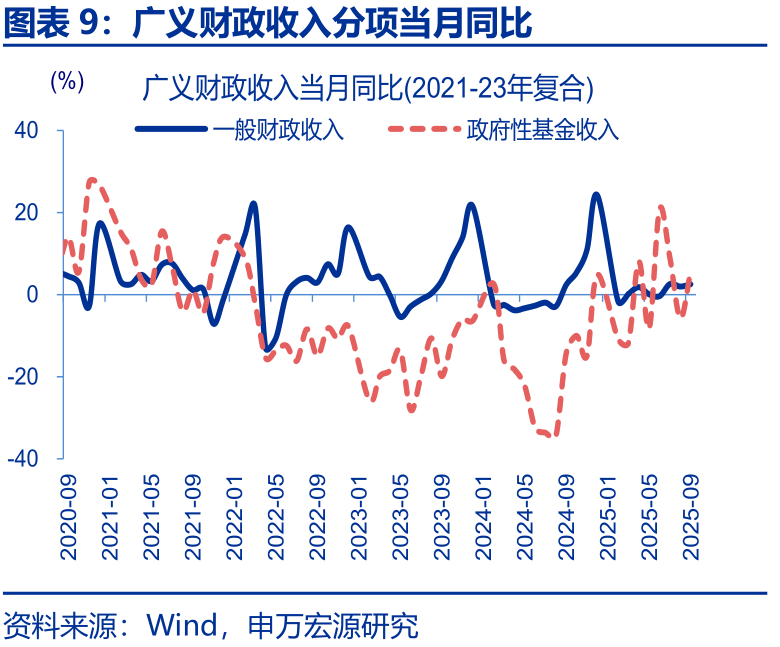 一般财政收入、政府性基金收入均有改善,带动广义财政收入增速回升。2025年9月广义财政收入同比3.2%,较8月同比回升2.9个百分点;其中,政府性基金收入同比5.6%,一般财政收入同比2.6%。从预算完成度看,2025年9月广义财政收入预算完成7.1%,略高于2024年同期的6.6%,略低于过去五年平均的7.2%。