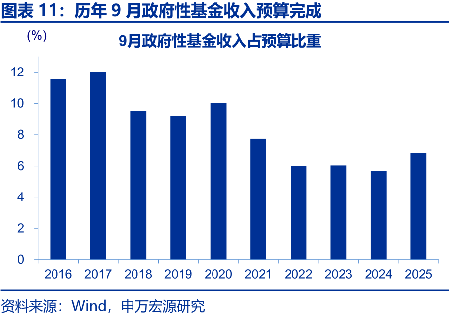 土地出让收入降幅收窄,推动政府性基金收入边际修复。2025年9月,政府性基金收入同比5.6%,较8月增速回升11.3个百分点;其中,地方国有土地出让收入同比-10.3%,较8月增速回升15.7个百分点。2025年9月政府性基金收入预算完成度为6.8%,高于2024年同期的5.7%和但低于过去五年同期平均7.1%。