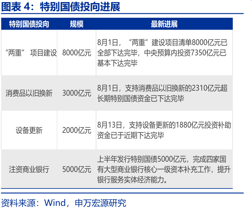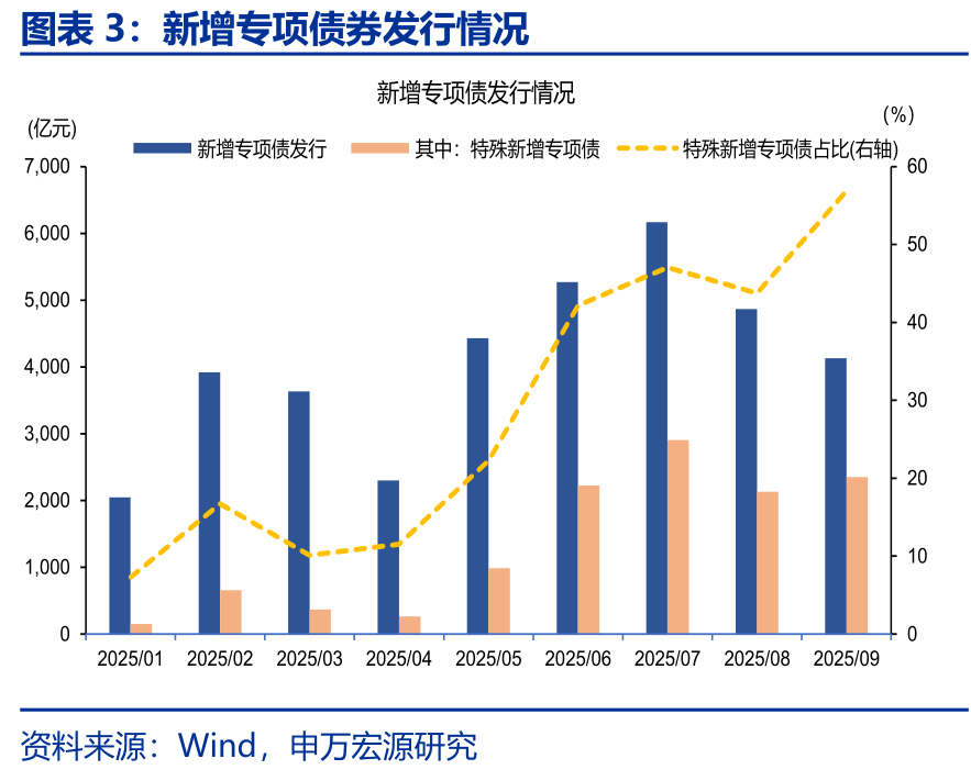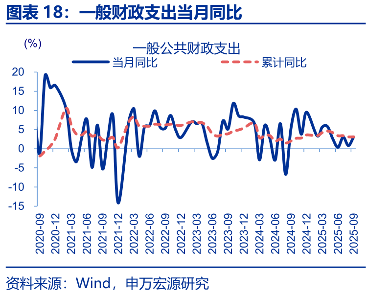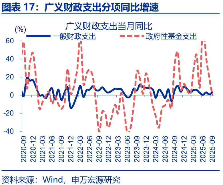 广义财政支出继续降速,或主因政府债务融资大规模支持阶段已过。截至9月28日,国债净融资+新增一般债+新增专项债累计发行10.3万亿元,发行进度87%;新增专项债累计发行进度83%,同比落后2024年同期6个百分点。同时,截至8月中旬,除第四批消费品“以旧换新”资金外,注资商业银行、“两重”项目、设备更新等也已基本下达完毕。