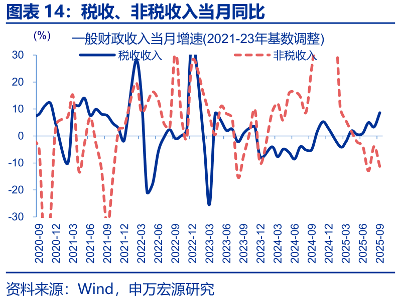 税收收入边际回暖,非税收入降幅走阔,促使一般财政收入小幅改善。2025年9月,一般财政收入同比2.6%,较8月回升0.6个百分点;非税收入降幅走阔,9月同比-11.4%、较8月降幅走阔7.6个百分点;税收收入边际回暖,9月同比8.7%,较8月回升5.3个百分点。其中,印花税延续高增速,9月同比189.3%;国内增值税、国内消费税有所改善,9月增速分别较8月提升3.2个百分点、2.9个百分点,达7.6%、3.8%;土地和房地产相关税收降幅明显收窄,9月同比-3.4%。2025年9月一般财政收入预算完成7.1%,略低于过去五年同期平均的7.2%。