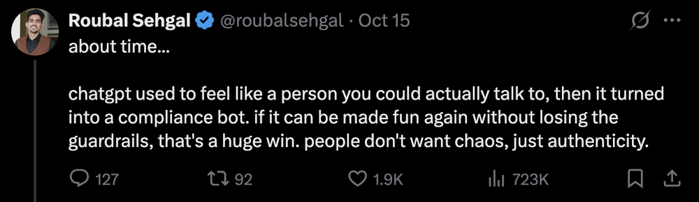 有用户表示,ChatGPT过去更像一个能实实在在聊天儿的人,现在变成了合规机器人。“人们不想要吵闹,只想要可靠。”